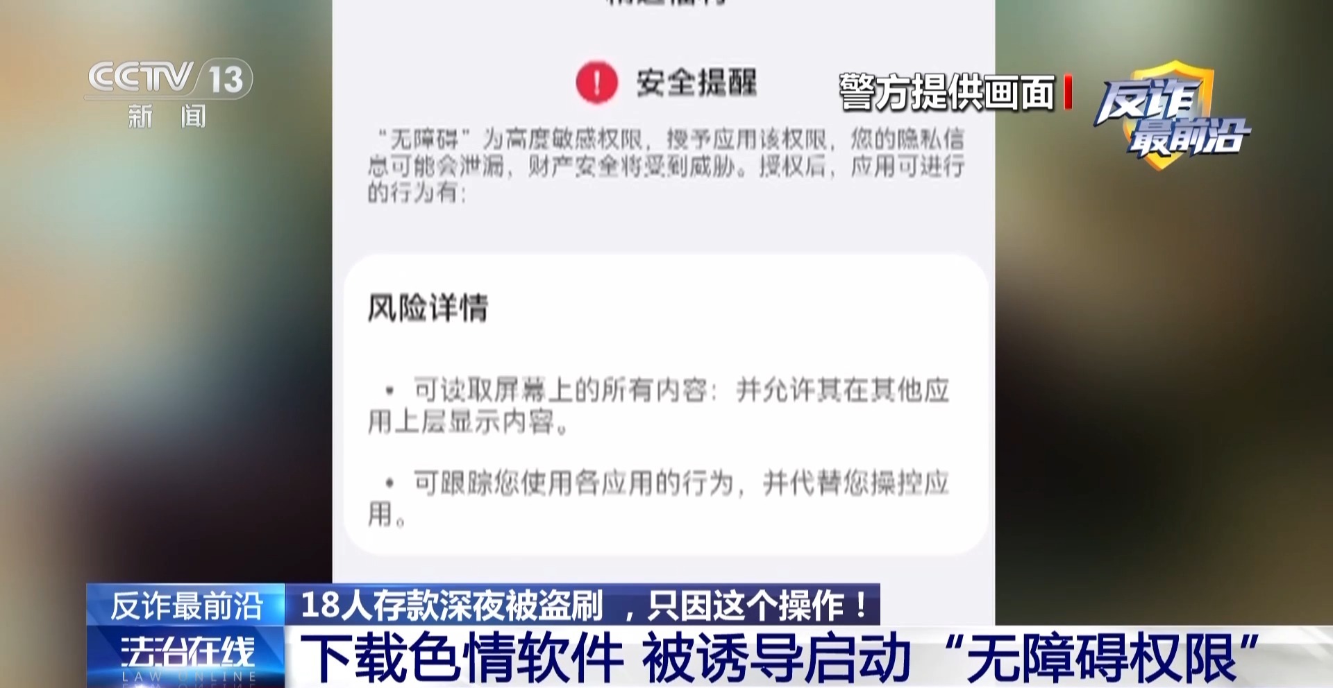 北京市公安局刑侦总队新型犯罪研究中心中队长 单丹:“无障碍权限”就是为了方便老年人不方便操作的时候,子女帮他开通了远程代为操作,或者是软件工程师帮你调试软件的时候,你打开电脑交付了权限,软件工程师就可以帮助调试软件,让他远程修复一些漏洞。正常通过应用商城下载的软件,绝大多数都不需要开通无障碍权限。只有极个别的,像是软件工程师使用的软件,可能才需要开通无障碍权限。一旦开通了,就相当于把你的手机交付给了对方。